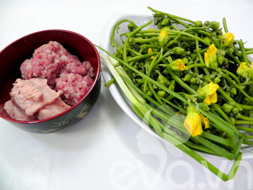 Bước 1: Bông mướp lặt bỏ cọng già, tước xơ, ngâm rửa sạch với muối, để ráo nước.